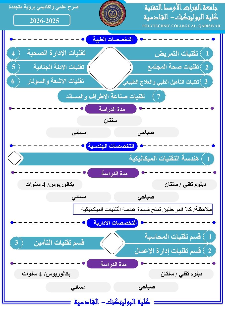 إعلان تعلن كلية البوليتكنك – القادسية عن إستمرار التقديم إلى الدراسة المسائية للعام الدراسي (2025 – 2026) في أقسامها الطبية ، والهندسية ، والإدارية. [رابط التسجي...