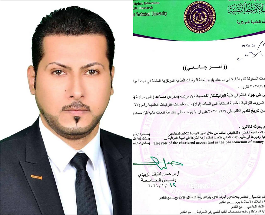Assistant Lecturer Ali Jawad Kazem, a faculty memb... Assistant Lecturer Ali Jawad Kazem, a faculty member in the Department of Accounting Technologies, has been awarded an academic promotion from the rank of Assi...