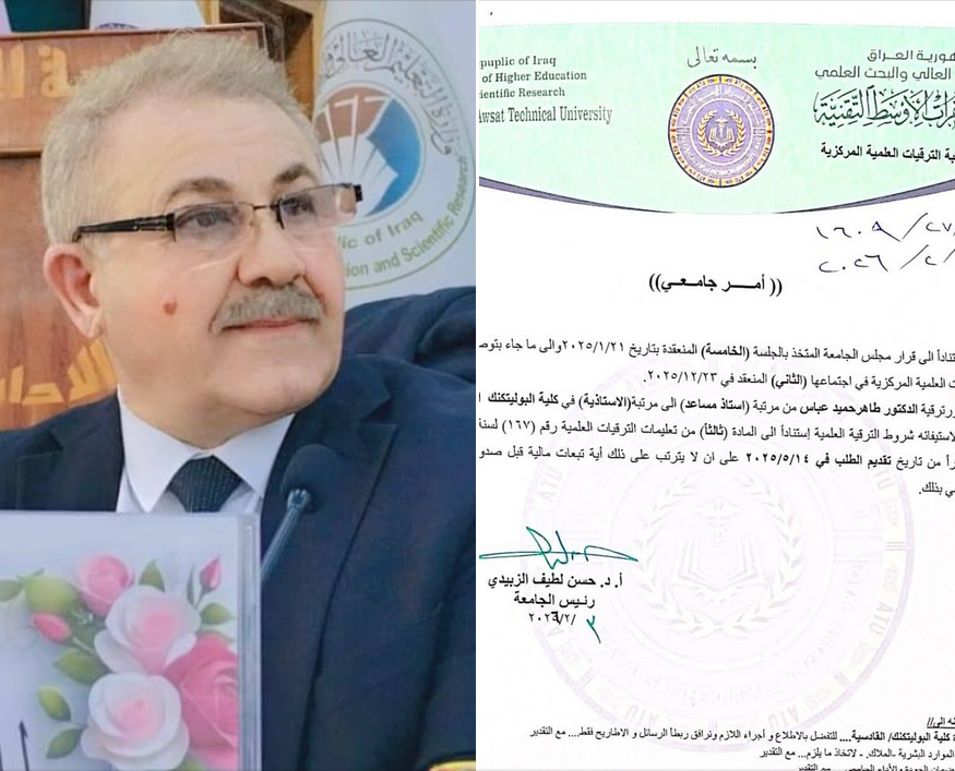 The Deanship and staff of Al-Qadisiyah Polytechnic... This promotion comes in recognition of his distinguished scientific and academic efforts and his contributions to the development of the educational process an...